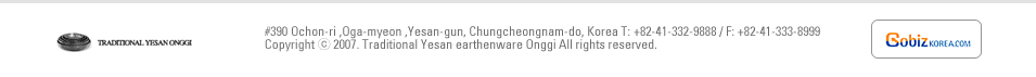 Hwang Choong-Gil, meister of Yesan Onggi, has succeeded to family business of 4 generations. Considering our history uneven, it¡¯s more excellent thing. Even meister¡¯s sons and daughters in law got to succeed to family business, who will develop traditional Onggi culture of Korea generation by generation and keep on creating traditions. |